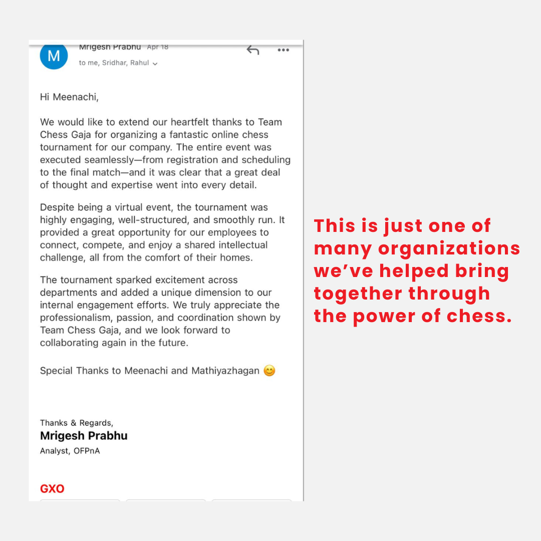 Recently, we had the pleasure of organizing an online corporate chess tournament for the amazing team at GXO – and the feedback we received truly warmed our hearts. ❤️ Here’s a quick look at what Mr. Mrigesh Prabhu from GXO had to say: | |